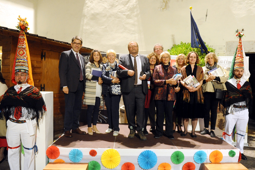 Publications presented to the official speakers: Carnevale re d’Europa, di Giovanni Kezich, Priuli & Verlucca editori, 2015 • Carnival King of Europe II. Documentary films, eds. Giovanni Kezich, Antonella Mott, Michele Trentini, 2012 • Laureates 2017 European Union Prize for Culturale Heritage / Europa Nostra Awards. From left: Paola Matonti, President of the Museo degli Usi e Costumi della Gente Trentina • Walter Viola, Vice-President of the Council of the Autonomous Province of Trento • Franco Panizza, Senator of the Italian Republic • Clelia Sandri, Major of San Michele all’Adige |